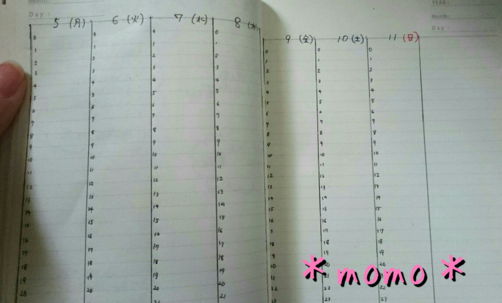 カレンダーみたいに自作して印刷して張り付けても良かったけど、あまり紙を貼るとノートが膨らんでしまうかなと思ったので、あえての手書きです。