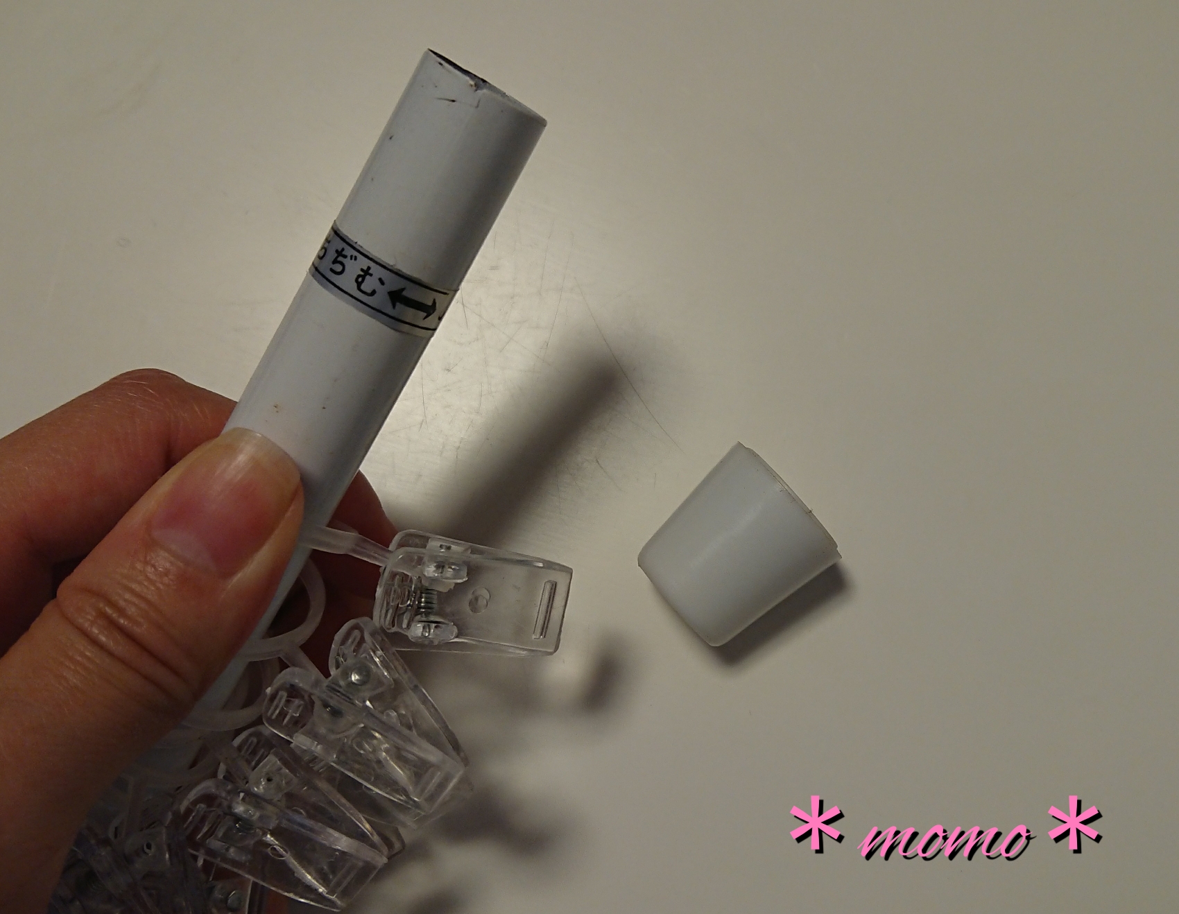 しかし、突っ張り棒にカーテンクリップを通そうと思ってみると、輪のサイズと突っ張り棒の太さが合わず。