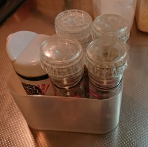 この上には塩コショウやガーリックパウダーを乗せたいけど、そのままだと不安定で倒れたりしても嫌なので積み重ねボックスに立ててから乗せることにしました。