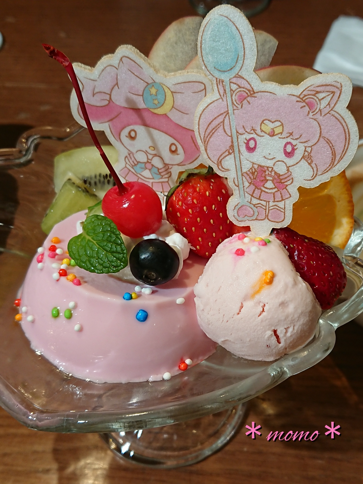 ヴィーナスのケーキが食べれなかったので、ちびムーンのプリンアラモードを注文しました。